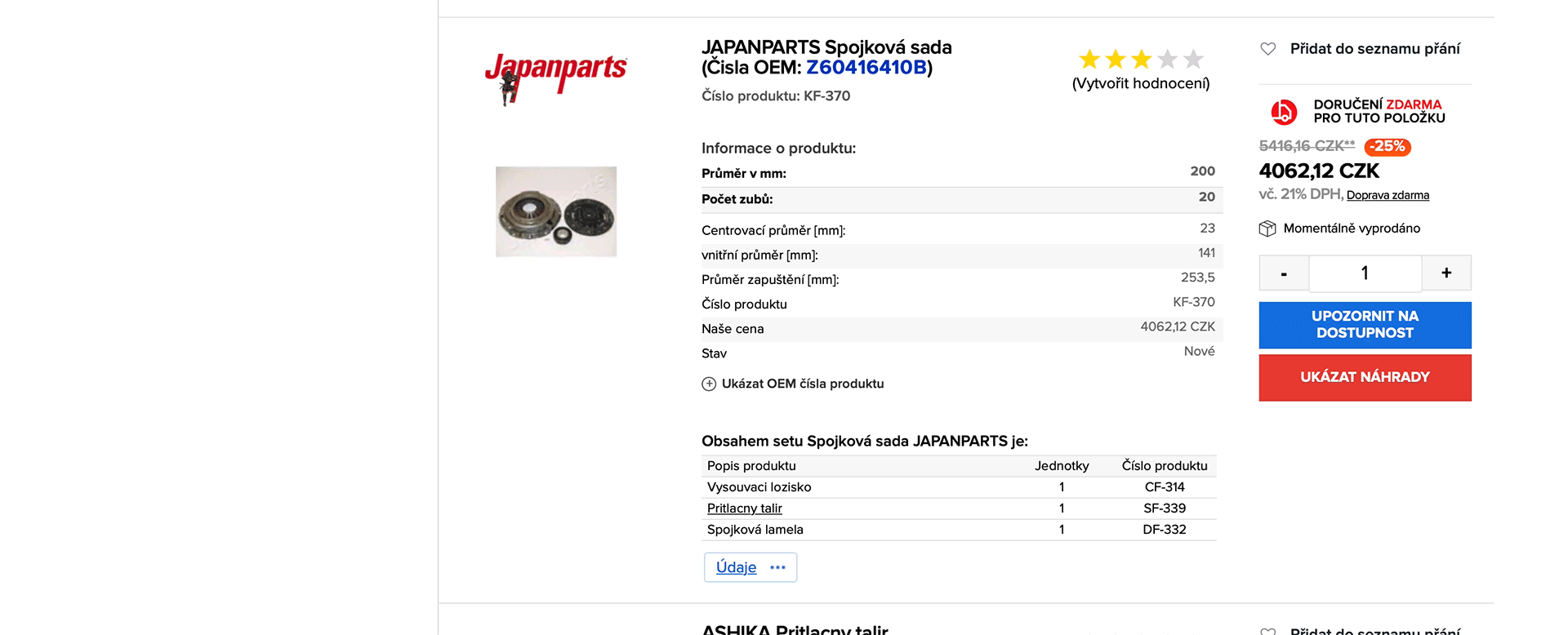 Seznam alternativ se zobrazí, pokud hledáte díly dle OEM čísla. Alternativa je produkt, který má podobné nebo identické vlastnosti. Hned po zadání OEM čísla nezapomeňte porovnat vlastnosti alternativ zobrazených v seznamu. Pokud si musíte vybrat z mnoha výsledků hledání, pozorně si přečtěte a porovnejte vlastnosti alternativních produktů s originálními produkty, nebo kontaktujte tým služeb pro zákazníky a požádejte ho o pomoc. Pokud náhradní díl, který potřebujete, je momentálně vyprodán, použijte tlačítko "Ukázat náhrady". Zobrazí se vám seznam produktů s podobnými nebo identickými vlastnostmi, avšak od jiných značek, a možná i z jiných cenových kategorií.