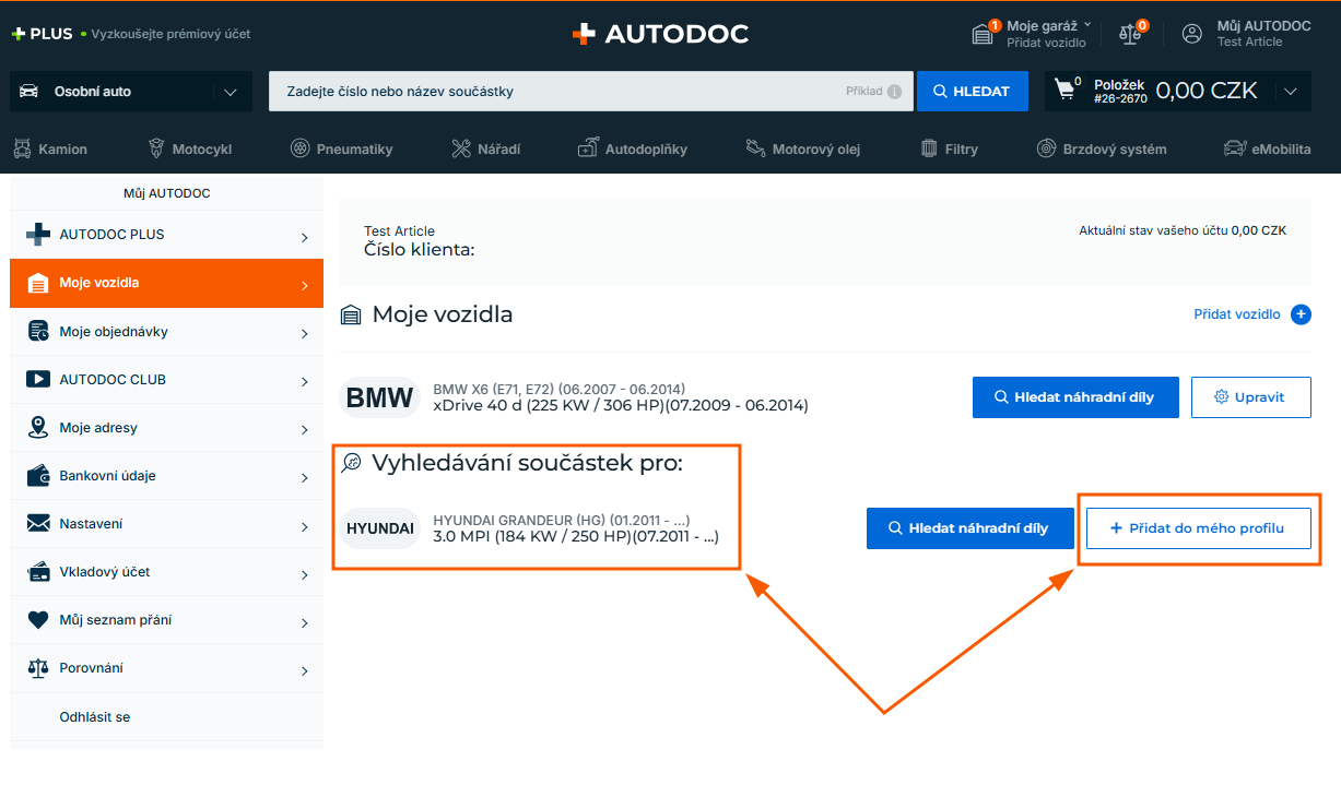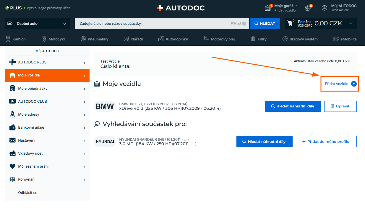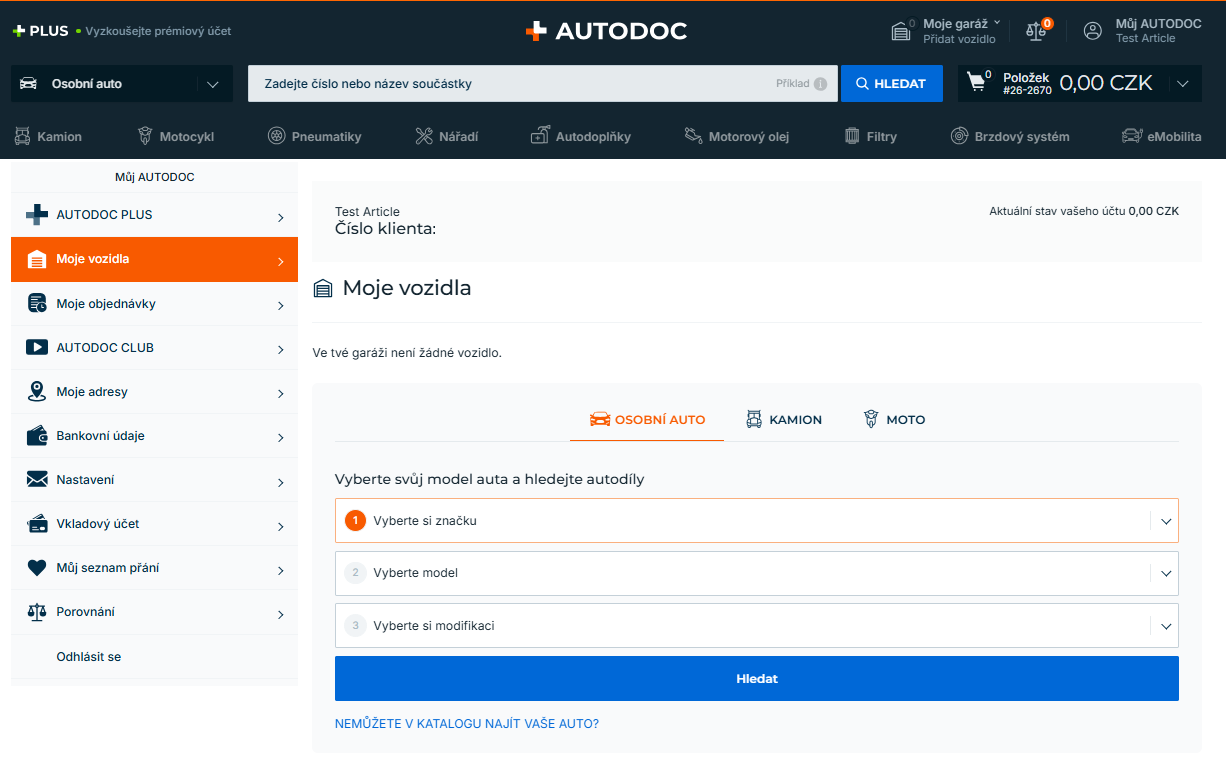 Sekce "Moje vozidla" umožňuje rychle přejít do katalogu s náhradními díly určenými pro auta, pro které jste součástky již hledali nebo koupili v našem online obchodě.