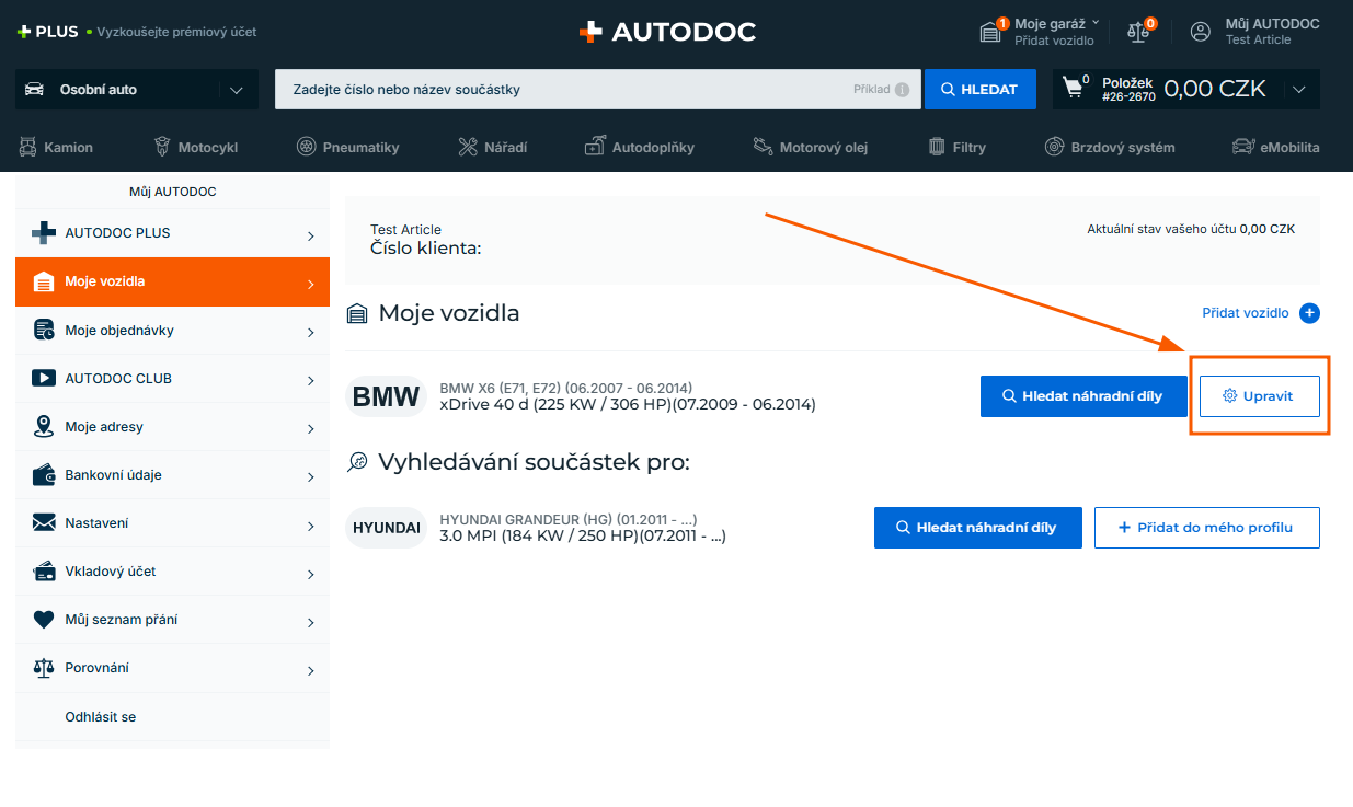 Chcete-li změnit údaje o vozidle v garáži, klikněte na tlačítko „Upravit“, změňte data a uložte změny.Chcete-li do vaší garáže přidat více vozidel, můžete si vybrat kterékoliv vozidlo ze sekce "Vyhledávání součástek pro:" a kliknout na možnost "Přidat do mého profilu". Následně se okamžitě přidají do vašeho seznamu vozidel.