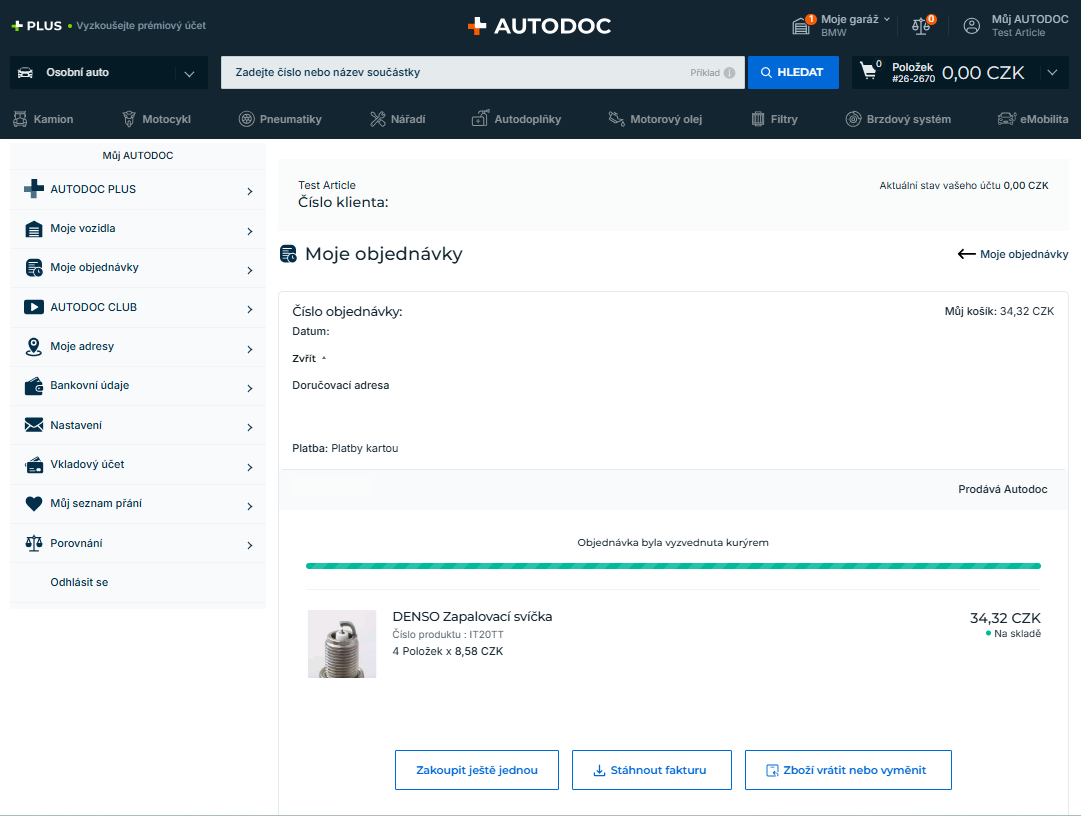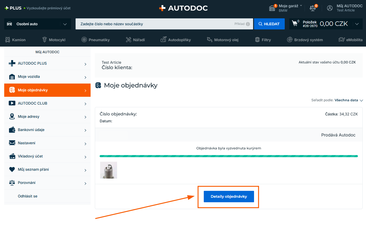 Sekce „Moje objednávky“ poskytuje informace o objednávkách, které byly odeslány a doručeny. Pro vytvoření žádosti o vrácení zboží klikněte na možnost „Detaily objednávky“.