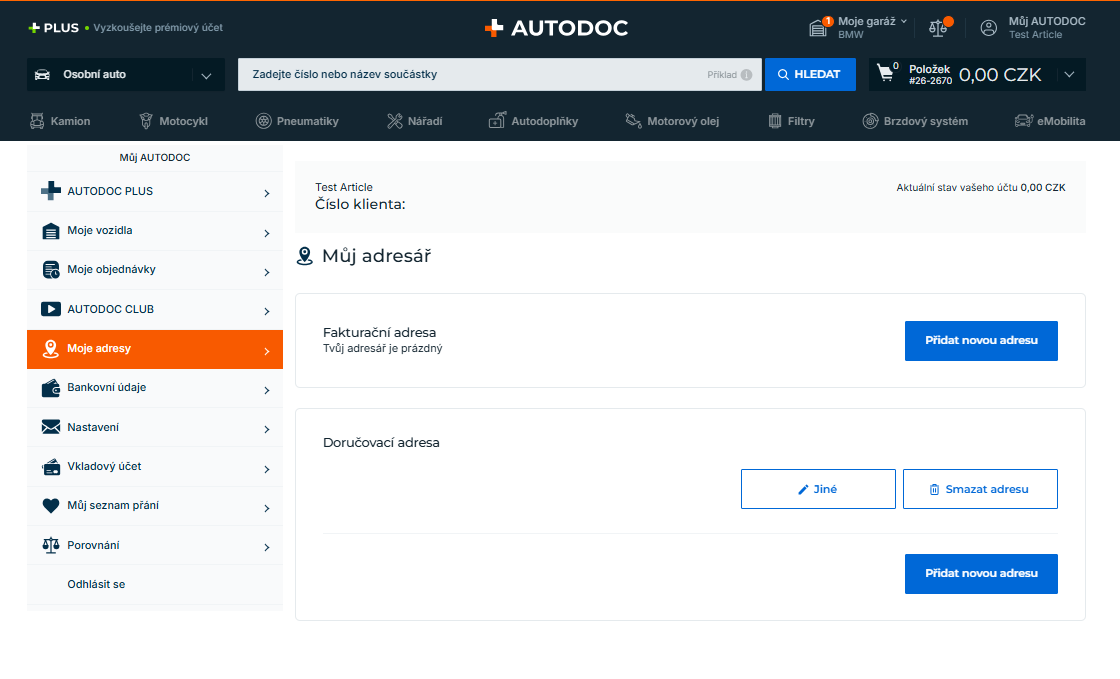 Ve vašem osobním účtu můžete upravovat jakékoliv osobní údaje a adresy. Změny, které provedete, se zobrazí pouze při budoucích objednávkách. Pokud jste již vytvořili objednávku, veškeré změny provedené ve vašem osobním účtu nebudou uplatněny na tuto objednávku.