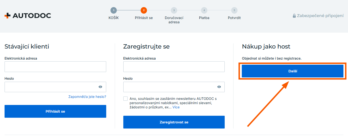 - Zvol možnost Nákup jako host kliknutím na tlačítko Další.